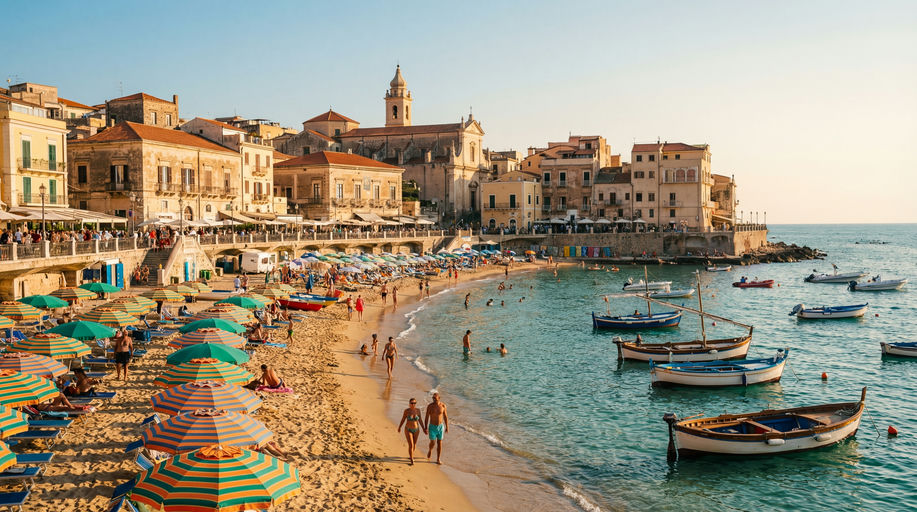 Lively beach near a coastal town, perfect for summer and travel product photography.