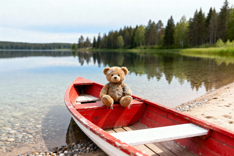 A small rowboat on a calm lake with a teddy bear offers a peaceful and nostalgic children's backdrop.