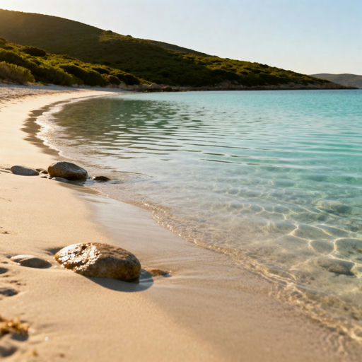 Tranquil, secluded bay with calm turquoise waters, soft sand, and distant green hills.