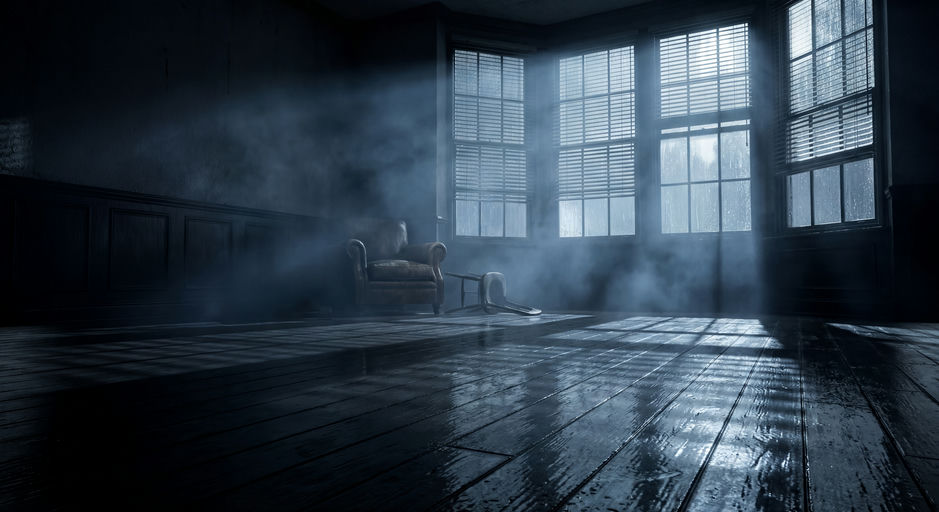 Low-angle shot of a dark wooden floor with rain-streaked blinds, diffused moonlight, and atmospheric fog.